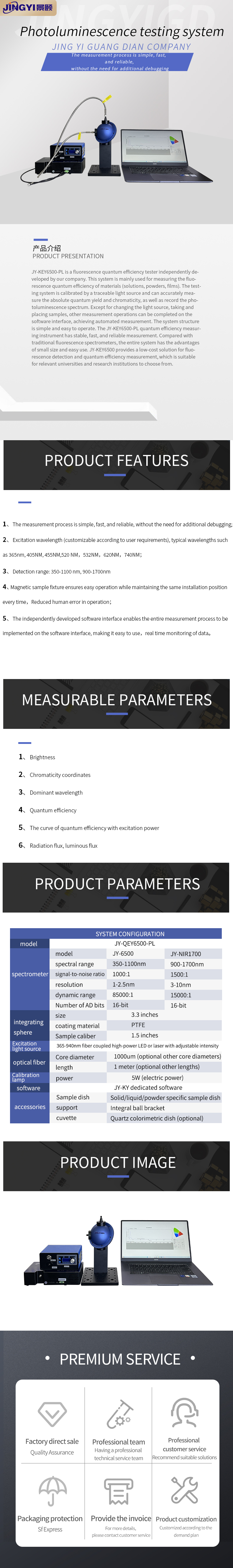 JY-QEY6500-PL is a fluorescence quantum efficiency tester independently developed by our company. This system is mainly used for measuring the fluorescence quantum efficiency of materials (solutions, powders, films). The testing system is calibrated using a traceable light source and can accurately measure absolute quantum yield and chromaticity, while also enabling photoluminescence spectrum measurement and recording. Except for replacing the light source and handling samples, all other measurement operations can be completed on the software interface, achieving automated measurement. The system structure is simple and easy to operate. The JY-QEY6500-PL quantum efficiency instrument provides stable, fast, and reliable measurements. Compared with traditional fluorescence spectrometers, the entire system has advantages such as compact size and ease of use. JY-QEY6500 offers a low-cost solution for fluorescence detection and quantum efficiency measurement, suitable for universities and research institutions.