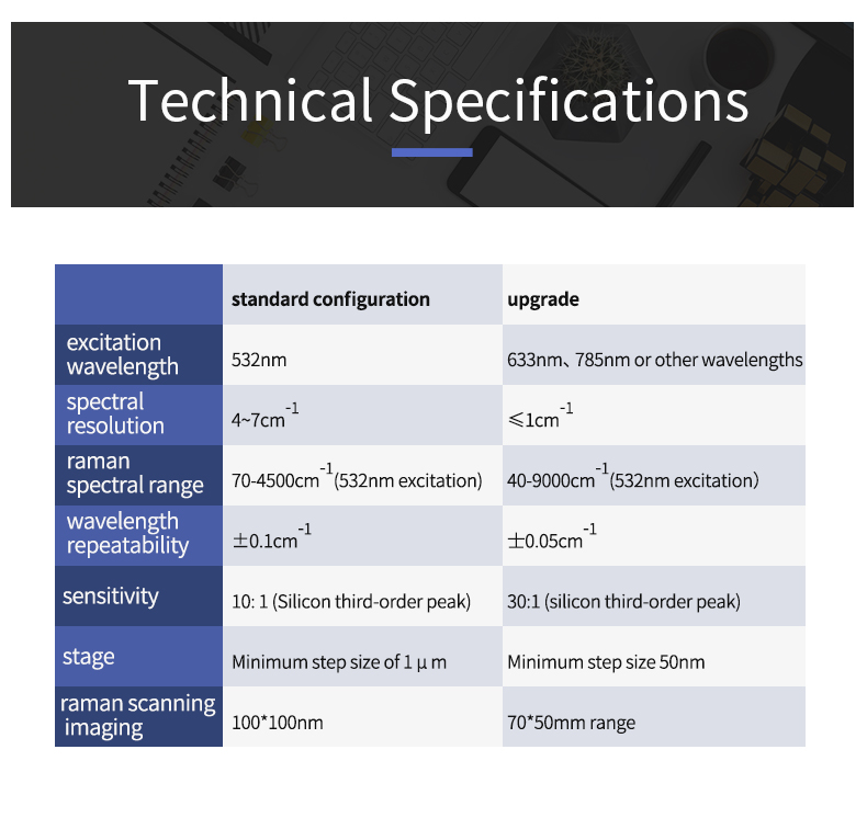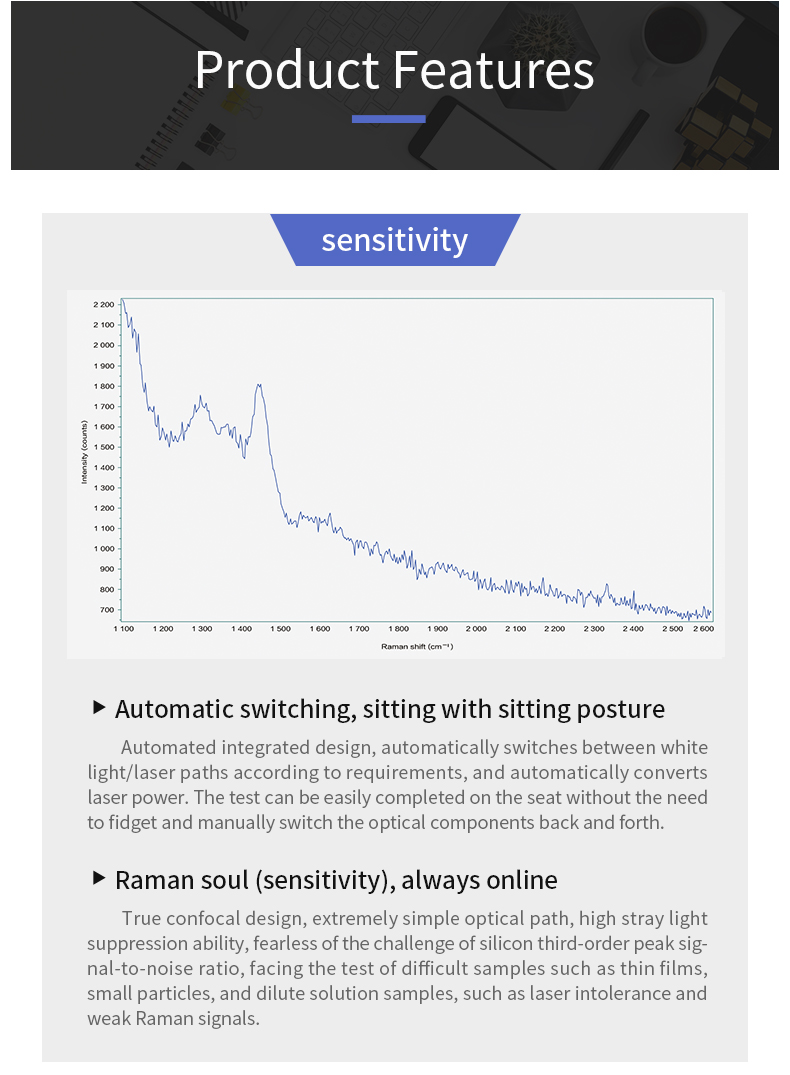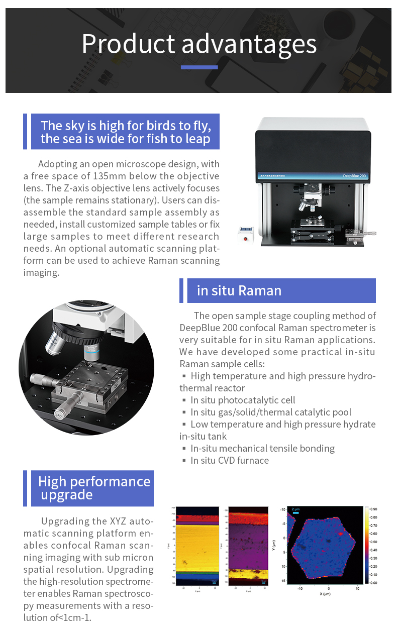 Upgraded XYZ automatic scanning platform enables sub-micron spatial resolution confocal Raman scanning imaging. With enhanced high-resolution spectrometers, Raman spectroscopy with resolution <1 cm⁻¹ is achievable.
