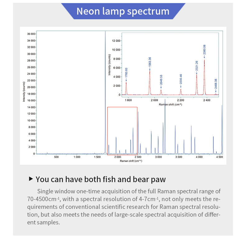 Single-port acquisition covers the full Raman spectrum range from 70 to 4500 cm⁻¹ with a spectral resolution of 4–7 cm⁻¹. This balances high-resolution scientific research needs with broad-range spectral collection for diverse samples.